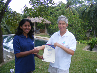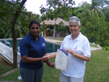 We are especially pleased to have Sanduni return down south to us for further formal STA training as a pre-cursor to taking up a unique post in the Middle East as a member of an all-girl team running a Ladies Only Beach just opening up in Dubai. Sanduni is very excited by this job and has ambitions to save up enough money to build her own swim school in her own village in Sri Lanka upon her return. We congratulate Sanduni on her fine achievement and look forward to hearing about her activities in Dubai. Finally, it should be mentioned that there were more students on this STA course than the two mentioned thus far; the additional teachers have yet to build up more teaching hours before we can hand them their certificates. The reason for this that the adults we teach have had absolutely no previous experience in water and have only learned to swim a matter of months ago. Although they are now competent swimmers, they lack a whole swathe of aquatic experiences which western children start accumulating from about age four, from things as simple as picking up sticks and things from the deep end to games such as swimming underwater leap-frog. Taken together with all the water safety issues we take for granted in our culture, much of what we assume to be common aquatic knowledge still has to be learned by our teachers before we let them ‘go solo’. So there will be more news of more teachers to come. Well done Dinusha. Well done Sanduni. |